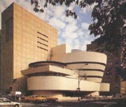 在纽约的大街上,这座博物馆的体形显得极为特殊。那上大下小的螺旋形体,沉重封闭的外貌、不显眼的入口,异常的尺度等等,使这座建筑看来象是童话世界中的房子。如果放在开阔的自然环境中,它可能是很动人的,可是蜷伏在周围林立的高楼大厦之间,就令人感到局促而不自然,它同纽约的街道和建筑无法协调。