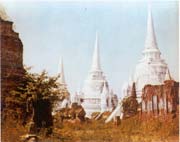 这些堵波是砖砌的,刷成白色,同色彩浓重的木构建筑相映照,非常明艳。当时在阿瑜陀耶有这样的萃堵坡五百座以上。