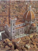 标志着意大利文艺复兴建筑史开始的,是佛罗伦萨主教堂的穹顶,主教堂是13世纪末行会从贵族手中夺取了政权后,作为共和政体的纪念碑而建造的。八边形的歌坛,对边宽度是42.2米,预计要用穹顶覆盖。这在当时,技术上十分困难,不仅跨度大,而且墙高超过了五十米,连脚手架的模架都是很艰巨的工程。
