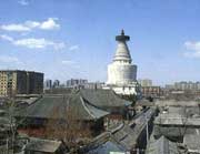 北京西城妙应寺塔在阜城门内大街路北,又称白塔,该寺建于元至元八年(公元1271年),初名大圣寿万安寺,至正二十八年(1368年)曾遭火焚,于明宣德八年(1433年)再建,改称妙应寺。因寺内有通体涂以白垩的塔,俗称白塔寺。是尼泊尔著名工匠阿尼哥的作品。全高约53米。