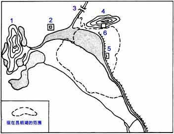 1-玉泉山 2-功德寺 3-青龙桥 4-瓮山 5-龙王庙 6-圆静寺