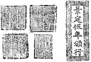 在1985年年底举办的"安徽省文物珍品展览会"上,有一套宋代"金银见钱关子"印版,引起行家们的广泛重视。这套印版一共八块,是安徽省东至县的废品收购站从农民手中按废品收购来的。东至县地方志办公室闻讯后,将此套印版从废品站价拨过来,并转给了县文物部门。安徽省博物馆卢茂村先生向余详细地介绍了这套印版的发现、实物规格及鉴定情况。
