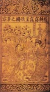 在金代的印刷品中,图版也占有一定的地位,图文并茂的书籍也不少,最具代表性的还是属平阳府。在一般书籍中图版的代表作是《重修政和证类本草》一书的草药插图,其插图与实物相似。 在现存的平阳印刷品中还有一张招帖画,这是一幅先进行印刷,后用彩色描绘的彩色印刷品,也具有一定的代表性。 以上图版反映了金代雕版艺术已达到相当高的水平。唐、宋时期的版画多为宗教佛像绘刻,金代已出现人物版画的刻印,标志着中国版画艺术已开始进入了新的阶段。 |