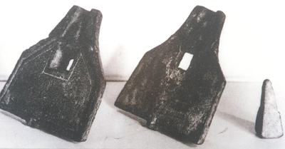 河北兴隆古洞沟出土。战国。由双合范、内范三件组成。一扇为器范,一扇是平底,一为四角锥状銎口范。范身上小下大,边缘有四个子母口,上部有一长方形銎;背面有弓形把手。