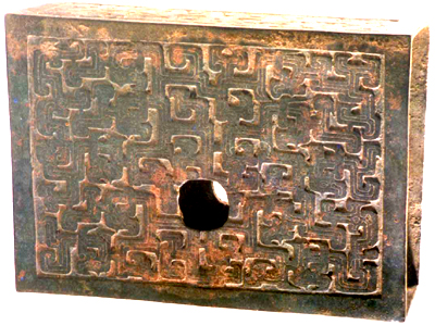 陕西凤翔姚家岗出土。春秋中期。饰件呈长方形,面饰蟠螭纹。较宽两面有相对穿孔。