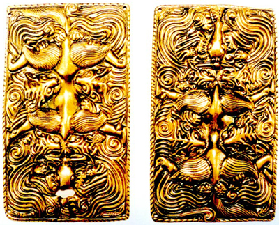 内蒙古杭锦旗阿鲁柴登出土。战国。两件,腰带装饰品,大小、图案均相同。正面为浅浮雕虎牛争斗图案。牛身躯平卧居中,四肢伸张,四虎从两侧咬住牛的颈及腹部,牛角刺穿虎耳。周边为绳索纹,四角穿圆孔,背面两端各有拱形钮。其中一件在牛首部有一椭圆形镂孔。题材新颖,动感强烈,具写实特色。