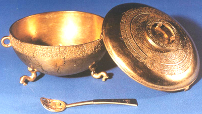 湖北随县擂鼓墩出土。战国早期。盛食器。盖顶有四柱支撑的环形提钮,盖沿有三个等距的衔扣。平口,口沿外侧有对称环耳,三足作向外弯曲的倒置凤首。提钮面饰涡云纹,盖面饰蟠螭纹、绹纹、勾连雷纹四周,口沿下饰蟠螭纹一周。鼎内有一镂空金匕,浅圆窝形,扁柄,镂空涡云纹。金鼎器形别致,庄重美观。为中国已出土先秦金器中最重大的一件。