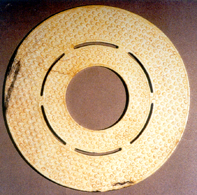 战国。玉料呈白色。个体较大,厚薄均匀,重环,其间有六处相互联结。两面皆为谷纹,排列有序。外环边缘上有六个分布均匀的小孔,用以穿系悬佩。
