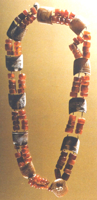 河南三门峡上村岭出土。春秋。由一百零一枚鸡血石珠,十枚马蹄形石片、一枚椭圆形玉片和两枚小石饰组成。鸡血色石珠用双线串成二行,每隔若干枚(最多者十四枚分作两行并列,最少者六枚分作两行并列,其它界于二者数量之间,但多少不等,亦分两行串连)珠子,双线并穿入一枚马蹄形玉片中。椭圆形玉片垂于整组项饰的下方。上述鸡血色石珠的形状和大小皆不一致。马蹄形玉片皆以璞玉制成,正面雕琢双阴线勾连纹。背面平齐,两端壁上各钻一孔,与底面孔相通,用于贯线串连。椭圆形玉片上刻双阴线周边和勾云纹。此项饰出土于墓主人的颈项间,系墓主人生前享用的项链,因受到死者的珍爱,死后用于陪葬,它红白相间,色彩绚丽,出土时排列有序,既有历史价值,又具珍贵的艺术性。