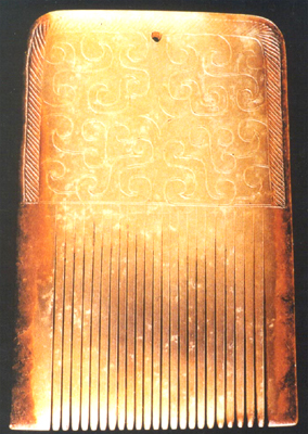湖北随县擂鼓墩出土。战国早期。玉料呈青色,体扁平,略呈梯形。梳背平直,转角圆滑,厚度至齿口渐薄。二十三齿,尖处薄锐。梳背两面皆阴刻云纹和斜线纹。