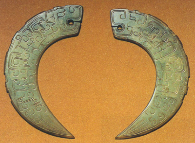 河南光山黄君孟墓出土。春秋。青色。体扁平,形似兽牙。两面皆以双钩饰一张口及侧身的夔龙纹。龙口有一小穿,可系佩。成对共存。