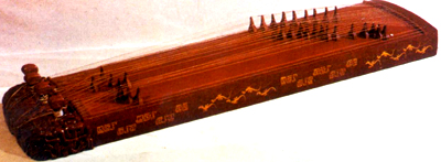 湖北随县擂鼓墩出土。战国早期。又称颂瑟。弦乐器。木质。长方体,以整木雕成,部分小构件另外加工后嵌附其上。瑟体内空,面板略拱,右侧横亘首嶽,左侧有外、中、内三条尾嶽。首尾嶽外侧各有二十五个弦孔,尾嶽旁尚有四个栓弦木枘,弦已朽烂无存。底板两端开有椭圆形孔为首。尾嶽间有狭长孔相连。瑟尾雕兽面,复又浮雕大小蟠螭,加施彩绘。通体黑漆底,上施红色。面板周沿和首内外侧板,均彩绘菱纹、变形鹿纹、云纹、龙纹和凤鸟纹,细腻繁褥。