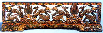 湖北江陵望山出土。战国中晚期。漆座屏为木质,两端着地,中部悬空,底座浮雕蛇、蟒,座上的长方形外框内透雕各种动物。整座漆屏共雕刻五十一个动物,其中有大蟒二十条,小蛇十一条,蛙两只,鹿、凤、雀四只。座屏周身髹黑漆,并用朱红、灰绿、金银等色漆彩绘凤纹等图案。这件漆座屏髹制精美,动物形态逼真,构图生动,堪称战国漆器中的精品。