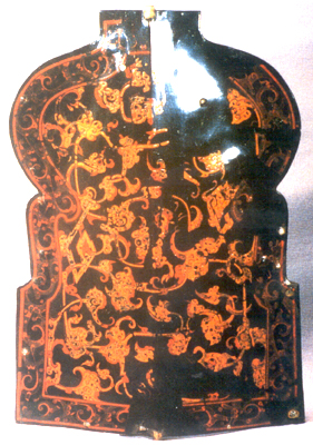湖南长沙五里牌出土。战国中期。此盾近似葫芦形,下边两角为方形,中间起棱。把手已失,但把手上的嵌银铜鼻尚存。盾为皮胎,两面均施黑漆。正面边缘绘赭红色云纹,中间用黄、红色漆绘蟠曲龙纹。背面边缘云纹为黄、红色,中间为红色蟠龙纹。这件漆盾制作极精,不似实用的防御武器。古代文献中有关于“万舞”的记载,“万舞”即是模拟作战的舞蹈。在这种舞蹈中,用盾、戚、戈为舞器。因此,这件漆盾可能是此类舞蹈的舞器,也可能用作仪仗或其它装饰品。顶部还阴刻“紫锦之衣”四字。
