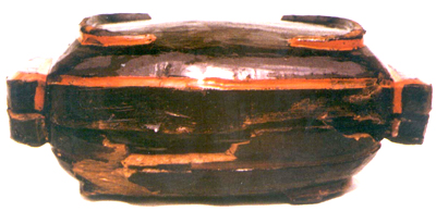 ¡¡¡¡ËÄ´¨Üþ¾Ôø¼Ò¹µ20ºÅĹ³öÍÁ¡£Õ½¹ú¡£¾ÆÆ÷¡£Ä¾Ì¥£¬ØàÖÆ¡£ÍÖÔ²ÐΣ¬·Ö¸Ç¡¢µ×Á½²¿·Ö¡£Æä´óСÐÎ×´¾ùÏàͬ¡£Æ÷ÉíΪֱ¿Ú£¬Ç³¸¹£¬Ô²µ×¡£¸¹²¿ÊÎÁ½µÀ°¼ÏÒÎÆ£¬¸Ç¡¢µ×ÉϾùÓаëÔ²ÐÎȦ×ãÒ»¶Ô£¬ÉÏÏÂÏàµÈ£¬Æä¼äÓÃÈý½ÇÐκͳ¤·½ÐεÄÁ½×é×Óĸ¿Ú¿ÛºÏ£¬»ëȻһÌå¡£ÄÚÍâ¾ù÷ÛºÚÆá£¬Î´Ê©²Ê»æ£¬¹ÅÆÓ¶ø¶Ëׯ¡£Æ÷µ×¿Ì¡°·¬Ñô