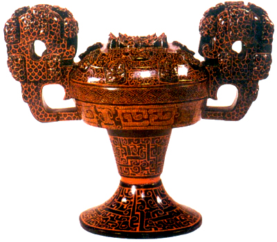 湖北随县曾侯乙墓出土。战国。盛食器。木胎。椭圆形,隆盖,两旁挖有新月形缺,以嵌器耳。盘,厚胎,浅腹,两侧附加方形大耳。柄上粗下细,喇叭形座。盖钮与双耳作仿铜浮雕龙形装饰:盖顶雕三龙,耳面内侧为龙形鼻、嘴的兽面,耳面外侧饰两龙,耳的两旁各饰一大龙,耳顶面作一首双身龙。以黑漆为地,浮雕部位施鳞纹并间以金点,其他部位朱绘云纹、菱形带纹、变形凤纹。雕刻精致,彩绘艳丽,如同新作。