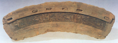 山西侯马铸铜遗址出土。鉴口沿部完整模,弧长37(为周长的六分之一),宽10厘米。外缘面上有八个长方形槽,挖出又填平,用途不明。面上有翻范的痕迹,甚清晰。饰斜角云纹,前尖,后分叉,互相衔接,填纹亦为斜角云纹。