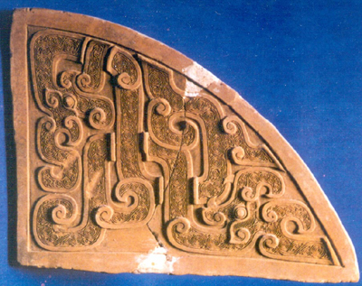 山西侯马铸铜遗址出土。钟舞部模。长17.5、宽13.2厘米。两螭相互缠绕。一螭锋外露,眼及转角外凸起,身填细密云纹。