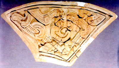 钟舞部模。其各边长度,内侧12、外侧36.5、左右侧分别为18.5和22厘米,厚4-5厘米。纹饰为浮雕式,凤眼凸出,冠高似飘起,篆下钩,身卷曲呈C形,转角处有一翅,填鳞片纹。造型浑朴,富于特色。