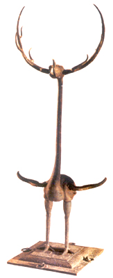 湖北随县擂鼓墩出土。战国早期。作鹤形伫立,展翅扬喙,头侧有双鹿角。角及首、颈上有错金云纹。下有方形承座,座面饰细密的蟠螭纹,四边有穿索用环。