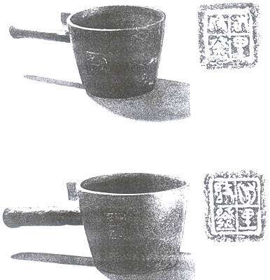 山东临淄出土。战国。上图铜量全长14.5、高6.1、口径8.1厘米,容260毫升。广口,壁铸戳式铭文“右里”四字。容量正合田齐一升。下图铜量,全长24.4、高9.4、口径13.2厘米,容1025毫升。器形、铭文均与上图铜量相似,容量则相当其五倍,当是战国齐五升之量。