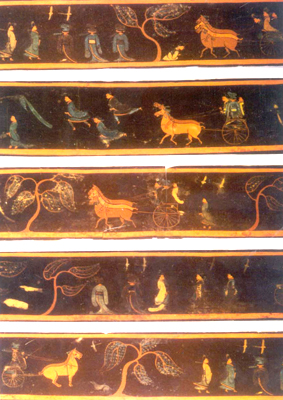 ¡¡¡¡ºþ±±¾£ÃŰüɽ³öÍÁ¡£Õ½¹úÖÐÆÚ¡£»ÃæÓÃÍÁ»Æ¡¢½Ûºì¡¢º£À¶¡¢×ØËÄÉ«»æÓÚÆáÞÆÖ®ÉÏ£¬ÓÐÈËÎï26¸ö£¬æî³µ£¨ÈýÂí¼Ý³µ£©¡¢æé³µ£¨¶þÂí¼Ý³µ£©¸÷Á½³Ë£¬´óÑã9Ö»£¬¹·2Ö»£¬Öí1Í·£¬Ê÷5¿Ã£¬¹¹³ÉÒ»·ùƸÀñÐÐÓͼ¡£»ÃæÓÃÊ÷ľ·Ö¸ôΪ5¶Î£¬ÓÖÒÔȮΪ¼ä¸ô£¬°´ÆäÇé½Ú·ÖΪÁ½´ó²¿·Ö¡£Ò»²¿·ÖÒÔ±¼³ÛµÄ³µÂí¡¢Ãá¹Ú´¹Ó§µÄ³ËÈË¡¢ñàÒÂÇààýµÄËæ´Ó¼°°Ý½ÓÕß×é³É£¬±íÏÖµÄÊÇÒ»ÅÉÆ¸ÎʳöÐÐ;Öеľ°Ïó¡£ÁíÒ»²¿·ÖÔòÓÉÆøÓîÐù°ºµÄ°ýÒ²©´øÕßÓë´ý·¢µÄæé³µÎªÖ÷Ì壬±íÏÖµÄÊÇÒ»·ùÖ÷¹ú³öʹӱöµÄ³¡Ãæ¡£´Ë»»æÓÚÆáÞÆ¸Ç²¿µÄÍâ±Ú£¬³öÍÁºóÓë¼ÐÀ‚Ì¥·ÖÀë¡£»ÖÐµÄæî³µºÍëݳµÎªÑо¿Õ½¹úµÄÂí³µÐÍÖÆÌṩÁËÖØÒªµÄ×ÊÁÏ¡£