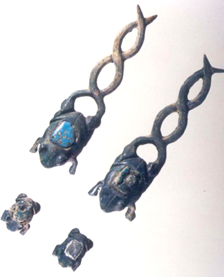 辽宁凌源三官甸子出土。战国早期。小者作蛙形,大者作双蛇捕蛙形,蛇身相纽结。蛙背均嵌绿松石。两蛇噬蛙也见于广西恭城所出蛙蛇纹尊,可见是当时南北不同民族都喜爱的一种主题。