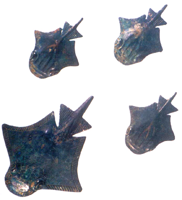 辽宁喀左南洞沟出土。春秋晚期。马饰作鳐鱼形。大者反面有两桥形钮。小者有十字形钮,以备穿带。出于北方民族石椁墓。象鳐鱼形,在青铜器中仅此一见。