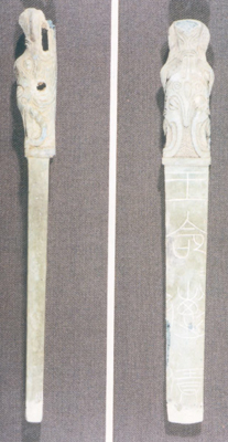 湖南长沙出土。战国中晚期。龙节长条形,上宽厚下窄薄,一端较大,一端较小。大的一端作龙头形,头长且大,额部有对称卷云纹,长鼻高卷,两眼突出,双耳后倾。双角弯曲,勾向两侧。嘴部透空,牙齿外露,下颔凸出。头下部两侧各有一圆穿,可以系结绳组,便于携带。两面刻铭文“王命,命传赁一檐似之”九字。龙节是使者持之远行可得食宿的证件。此节龙头圆雕铸造,间有阴刻线纹,风格粗犷而又细腻。铭文字体宽博,行笔精丽。因水坑浸渍而通体碧锈,尤为古雅。