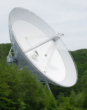 备注:埃菲尔斯伯格射电望远镜(Effelsberg)是目前世界上最大的全可动射电望远镜之一,位于德国波恩市西南方向约40千米的一个山谷中。这台望远镜的观测波段很宽,从90厘米到3毫米。其灵敏度和分辨率较高,率先在毫米波段观测到脉冲星的辐射,在射电星系、活动星系核、星际分子等的观测中也有上乘结果。