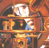 囚禁冷却的原子和“原子激光” 绝对零度(10nK)附近囚禁原子,原子的热运动十分弱。在磁场中,同时在三个方向上用激光照射被冷却的原子,原子将停留在激光的电场波动的谷内。实验上已经可将成千上万个原子囚禁在一个很小的范围内。有趣的是所有的原子还具有同样的动量。发射出来,一束原子具有与激光一样的性质,即空间和时间的相干性。人们在思考如何利用这一束原子“激光”。初步认为在通信和物质探索上会有重要的应用。 实验装置和实验情形,图中的 黄点是被囚禁的钠原子云。它的 温度为绝对温度的百万分之一。 被激光囚禁的铷原子云。表 面温度越低,被囚禁的铷原子 云的尺寸越小,更多的铷原子 云处在同一的量子态。 [上一页] [下一页]