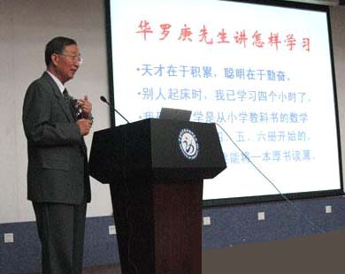 李振声院士谈华罗庚如何学习 华罗庚先生说天才在于积累,万丈高楼平地起,要靠一层一层的积累才可以达到科学高峰;聪明在于勤奋,他自己说,我认为我们绝大部分人都是中等智力,中等智力要想取得好的成绩必须靠自己的成份。他勤奋到什么程度呢?就是别人起床的时候他已经学习了四个小时了。当然我们现在不要求每位同学比别人多学四个小时,只希望你们把能够利用的时间充分利用起来。他说:我研究数学是从教科书的数学一二三四五六七开始,他是非常高深的数学家。可是他的基础是从小学一二三四五六开始的;他说当我把一二三四五六研究透了的时候,我觉得我对后面的数学研究起了非常好的作用。这就是刚才说的万丈高楼平地起,学习千万不要跳跃,要一步一个脚跟的学习。特别是数学是推理,如果前面断掉了,后面就没法推理了。 最后一条要学会读书,要能够把厚书读薄。大家想一想任何一本厚书,真正的精华并没有多少,如果你真正把这个书读懂了,读通了,把精华抓住了。而且最后你能够用自己的语言把它表达起来,那个书自然就变薄了。你可以拿一本书试一试;你如果用自己的语言把书表达出来,这个书就读通了读透了。 你要掌握知识,要掌握科学,大家从现在起就要刻苦学习。像华罗庚先生这样的精神去学习,大家一定能够成功,每一个同学都可以成功,你只要有这种学习精神! 同学们,现在已经进入到知识经济时代,无论做什么工作都需要知识。谁掌握了知识,谁就掌握了为社会服务的本领。掌握的知识越多,就可能服务的越好,做出更多更大的贡献。今天科技活动周的主题是弘扬科学精神,投身建设创新型国家。 祝同学们努力学习,勇于实践,不断创新,立志为建设新型国家做出卓有成效的贡献,谢谢大家。