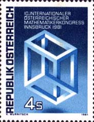 奥地利于1981年9月14日发行了一枚邮票,这次国际会议是在Innsbruck召开。上面的文字是说 "Impossible Construction of Cube" by M. C. Escher. " |