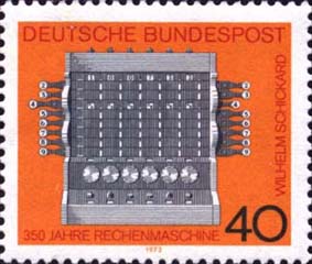德国1973年6月12日发行了为纪念由Tubingen大学Wilhelm Schickard教授建造计算机350周年的邮票。 |