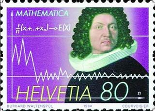 1994年,国际数学家大会第三次在苏黎士召开,当时发行的纪念邮票的图案是伯努利和他的大数律。 |