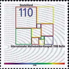 德国为纪念1998年国际数学家大会在柏林召开而柏林设计的邮票。这是“矩形求方”问题的一种解法,该问题是要把整数边的矩形分成具有整数边的大小不等的正方形。 |