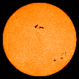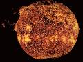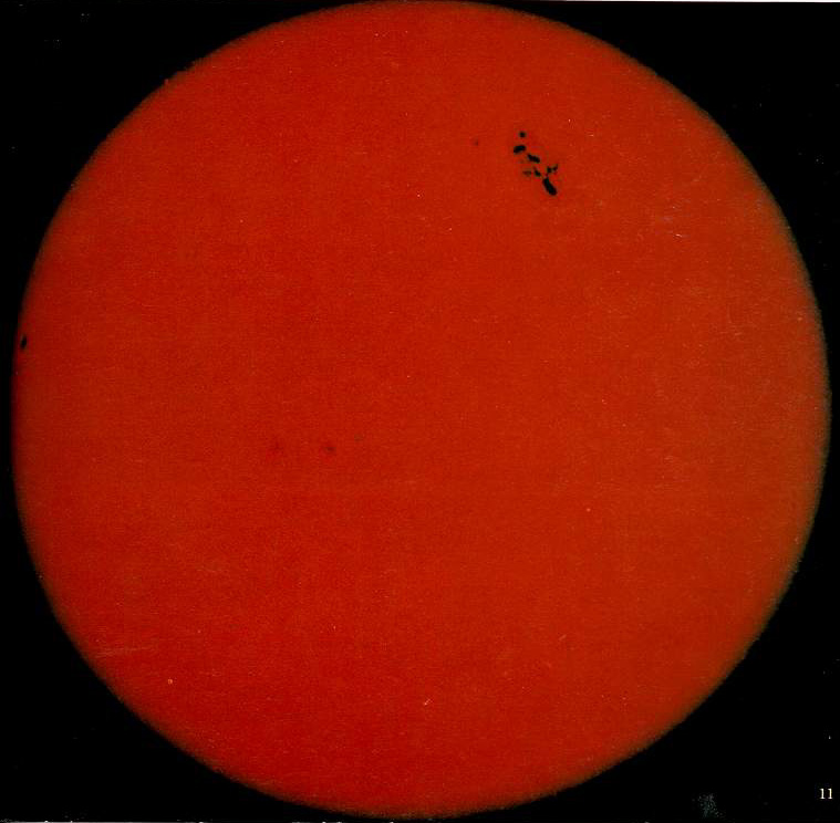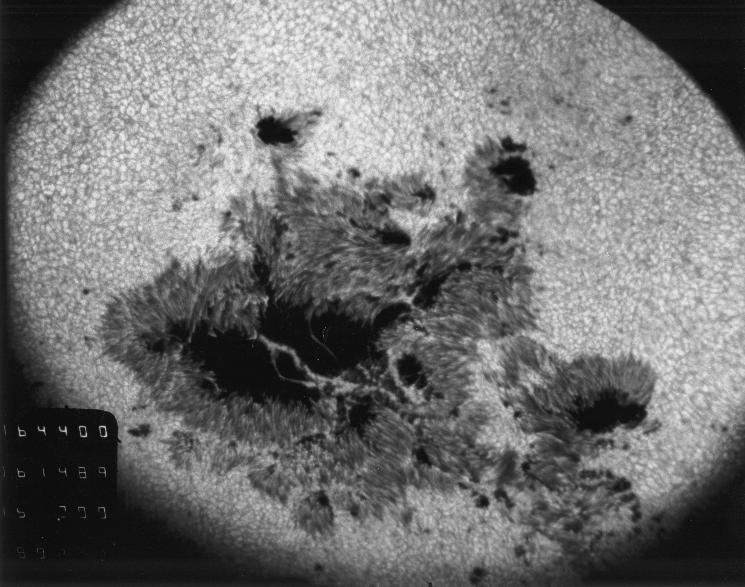 1989年3月5-18日的太阳表面一群黑子,面积约70个地球.10日黑子群爆发大耀斑,放出带电粒子和辐射,使地面多处无线电通讯中断