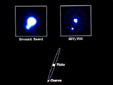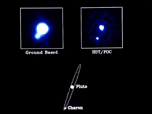 冥王星和它的卫星查龙, 左上图为地基望远镜拍摄的照片, 右上图为哈勃空间望远镜所摄照片