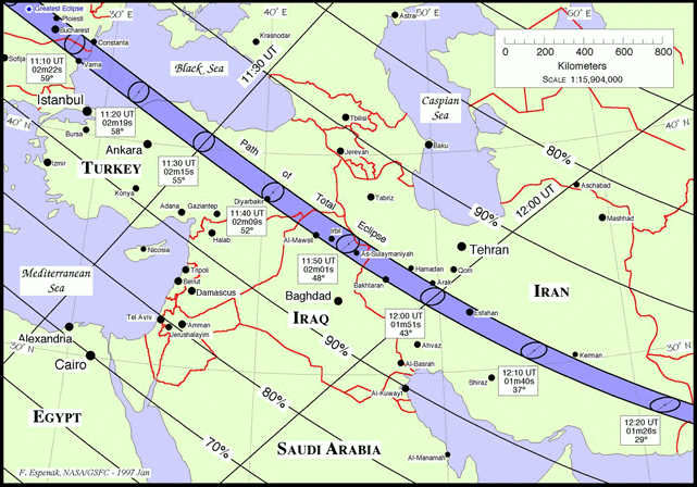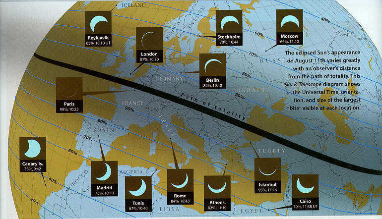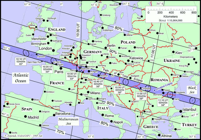 这次日食,全食带经过欧亚大陆许多国家的许多城市(从大西洋西海岸,经大西洋、英国南端、法国、德国,到西亚、印度北部和孟加拉湾)。其中罗马尼亚的布加勒斯特附近全食时间最长,是这次见食最好的地区。详细情况请见附表和附图。
