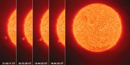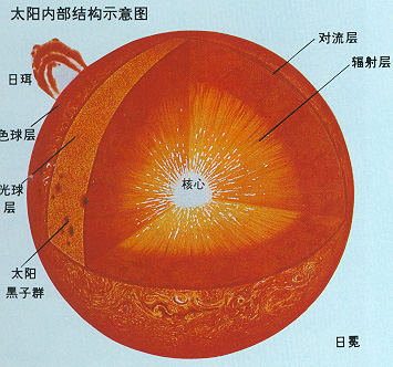 太阳和地球一样,也有大气层。太阳大气层从内到外可分为光球、色球和日冕三层。光球层厚约5000千米,我们所见到太阳的可见光,几乎全是由光球发出的。光球表面有颗粒状结构----“米粒组织”。光球上亮的区域叫光斑,暗的黑斑叫太阳黑子,太阳黑子的活动具有平均11.2年的周期。从光球表面到2000千米高度为色球层,它得在日全食时或用色球望远镜才能观测到,在色球层有谱斑、暗条和日珥,还时常发生剧烈的耀斑活动。色球层之外为日冕层,它温度极高,延伸到数倍太阳半径处,用空间望远镜可观察到X射线耀斑。日冕上有冕洞,而冕洞是太阳风的风源。日冕也得在日全食时或用日冕仪才可观测到。当太阳上有强烈爆发时,太阳风携带着的强大等离子流可能到达地球极区。这时,在地球两极则可看见瑰丽无比的极光。