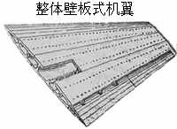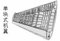 单块式机翼:随着飞行速度的进一步增大,为保持机翼有足够的局部刚度和扭转刚度,需要加厚蒙皮并增多桁条。这样,由厚蒙皮和桁条组成的壁板已经能够承受大部分弯矩,因而梁的凸缘就可以减弱,直至变为纵樯,于是就发展成为了没有翼梁的单块式机翼。单块式机翼的维形构件和受力构件已经完全合并。