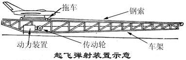 起飞弹射装置就是一个独立的起飞跑道,由拖车、车架、钢索和动力装置等组成。起飞时,飞机安放在拖车上,并点燃发动机。然后车架上的动力装置开始工作,通过传动鼓轮和钢索牵引拖车,来加大飞机的起飞推力,使飞机很快地加速到离地速度,脱离拖车而起飞。拖车靠车架上的减速装置而停止前进。