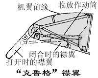 克鲁格襟翼:与前缘襟翼作用相同的还有一种克鲁格(Krueger)襟翼。它一般位于机翼前缘根部,靠作动筒收放。打开时,伸向机翼下前方,既增大机翼面积,又增大翼型弯度,具有较好的增升效果,同时构造也比较简单。