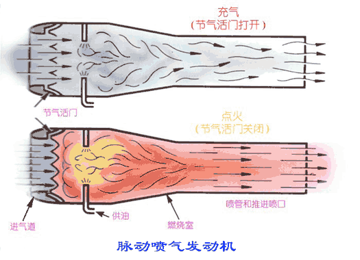 脉动喷气发动机是喷气发动机的一种,可用于靶机,导弹或航空模型上。德国纳粹在第二次世界大战的后期,曾用它来推动V-1导弹,轰炸过伦敦。这种发动机的结构如图所示,它的前部装有单向活门,之后是含有燃油喷嘴和火花塞的燃烧室,最后是特殊设计的长长的尾喷管。