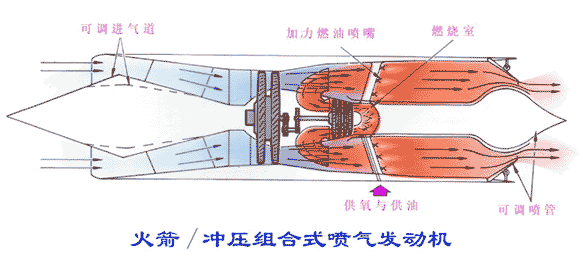 这种发动机压缩空气的方法,是靠飞行器高速飞行时的相对气流进入发动机进气道中减速,将动能转变成压力能(例如进气速度为3倍音速时,理论上可使空气压力提高37倍)。冲压发动机的工作时,高速气流迎面向发动机吹来,在进气道内扩张减速,气压和温度升高后进入燃烧室与燃油(一般为煤油)混合燃烧,将温度提高到2000一2200℃甚至更高,高温燃气随后经推进喷管膨胀加速,由喷口高速排出而产生推力。冲压发动机的推力与进气速度有关,如进气速度为3倍音速时,在地面产生的静推力可以超过2OO千牛。