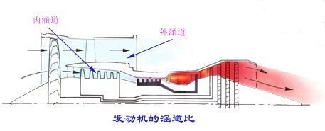 在结构上,通常将喷气发动机的压气机、燃烧室和涡轮叫做核心发动机或燃气发生器。 当空气流经涡轮风扇发动机的前端风扇后,分为两个部分:一部分气流进入燃气发生器,叫做内涵道;另一部分从燃气发生器的外围通过,称为外涵道。外涵道与内涵道的流量之比,叫做涵道比,也叫流量比。