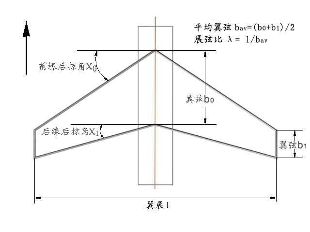 机翼的主要参数有翼展l、翼弦b、前缘后掠角χ、展弦比λ等(如图所示)。翼展是指机翼左右翼尖之间的长度;翼弦是指机翼沿机身方向的弦长,除了矩形机翼外,机翼不同地方的翼弦是不一样的;前缘后掠角是指机翼前缘与机身轴线的垂线之间的夹角;展弦比λ是翼展l和平均翼弦的比值。