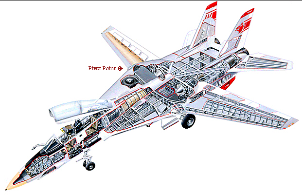 图中是F-14A“雄猫”舰载超音速战斗机的解剖图,可见变后掠翼由固定的内翼和可动的外翼组成,二者用转动枢纽联接。此外机翼前面还增设了可伸缩的小翼,用来改善变后掠翼的操纵性。在飞行中,F-14A的机翼前缘后掠角可以从20度变到68度;而在舰上停放时,后掠角最大可达75度,可以减少在航空母舰上所占的面积。此外,由于在航空母舰上起飞和着陆距离较短,因此要求舰载机有良好的起飞着陆性能,否则就要一头扎进大海了,F-14A采用变后掠翼技术正好能满足这一要求。