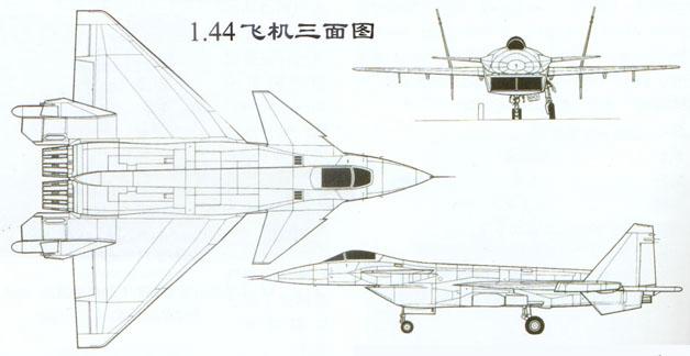 I.44是俄罗斯下一代战斗机的原型机,于1999年1月首次公诸于世,它是米高扬设计局研制的与苏霍依设计局的S-37竞争的机种。I.44采用鲨鱼头,鸭式布局。大尺寸全动鸭翼带有锯齿,能产生拖过主翼和机身的脱体涡以改善升阻特性;主翼为三角形中单翼,面积很大,机翼根部向后延伸至喷口后方并设有一对气动舵面。垂尾外倾,延伸至机翼平面以下形成腹鳍。I.44采用两台带推力矢量喷管的留里卡AL-41F发动机,单台推力196千牛。楔形进气道位于机头下方,S形进气道减少了雷达反射面积,有利于隐身。(由于资料保密,没有详细的性能数据)