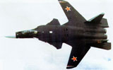 S-37是俄罗斯苏霍伊设计局设计的最新一代战斗机的原型机,或者叫技术验证机,绰号“金雕”,于1997年9月25日首飞成功。S-37采用三翼面双垂尾布局,主翼采用了非常规的前掠翼。该机采用了大量的先进技术,包括主动控制和推力矢量技术,其标志性特征则是前掠翼。前掠翼设计可以提高升阻比,改善操纵性,同时提供了较大的内部空间用于内载武器和燃油。